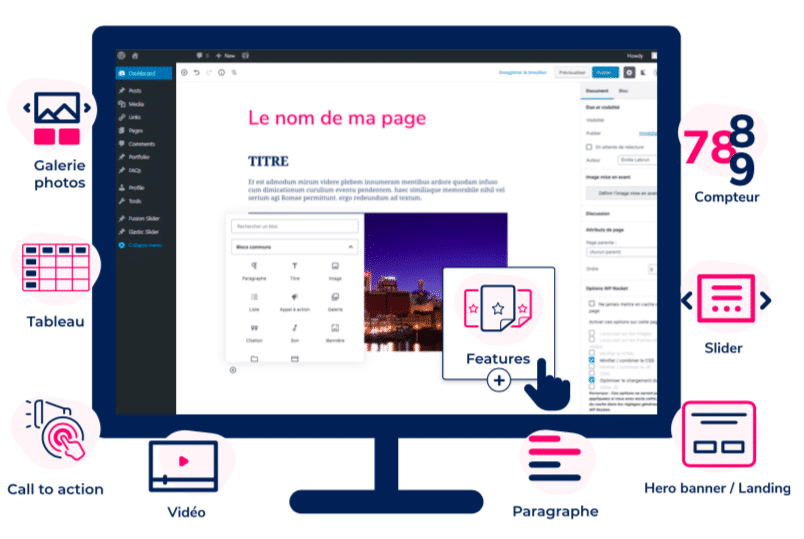 En outre, les blocs éditoriaux fournis par Gutenberg permettent d’aller bien plus loin éditorialement qu’avec l’ancien éditeur ou qu’avec les constructeurs de pages (page builders) qui étaient utilisés auparavant (ou qui le sont toujours pour certains comme Elementor, voir notre comparaison entre ce type de processus éditorial et celui de Gutenberg). De nombreux blocs éditoriaux sont disponibles par défaut, auxquels s’ajoutent les blocs éditoriaux créés par les éditeurs d’extensions (plugins) WordPress ainsi que les blocs Gutenberg réalisés sur-mesure pour votre projet, dans le cadre de nos offres BuildMyWP.
